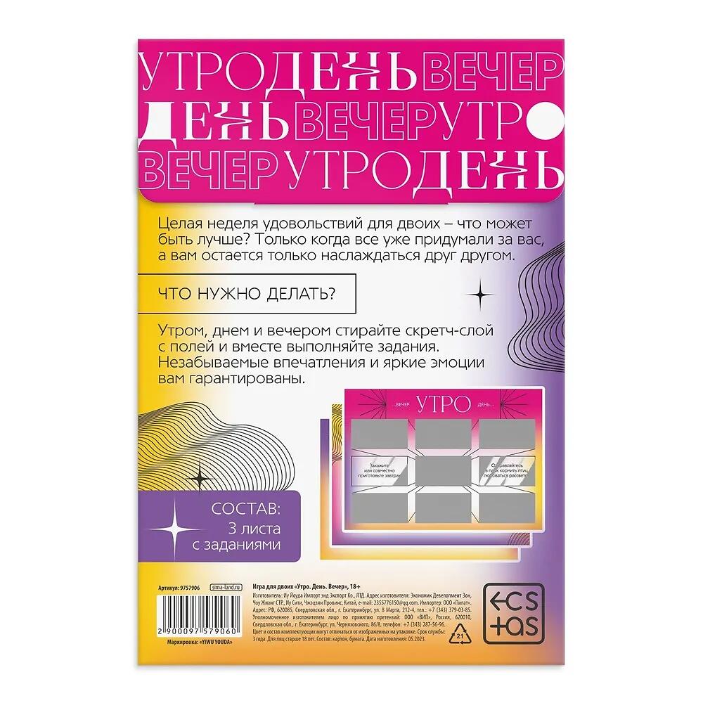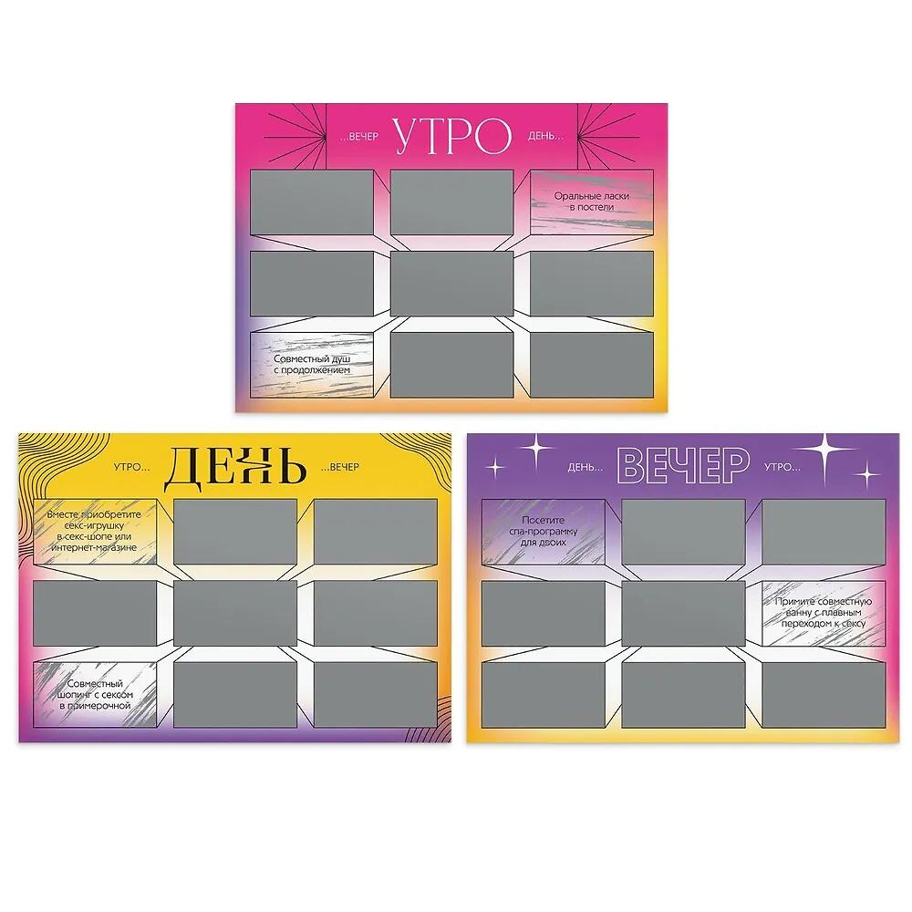 Дарите страсть и любовь Вас ждет неделя удовольствия, в которой каждый шаг расписан. Остается лишь наслаждаться друг другом и отпустить лишние запреты. Стирайте скретч-слой на протяжении дня и выполняйте задания, которые подарят обоим незабываемые впечатления и яркие эмоции. Состав: 3 листа с заданиями