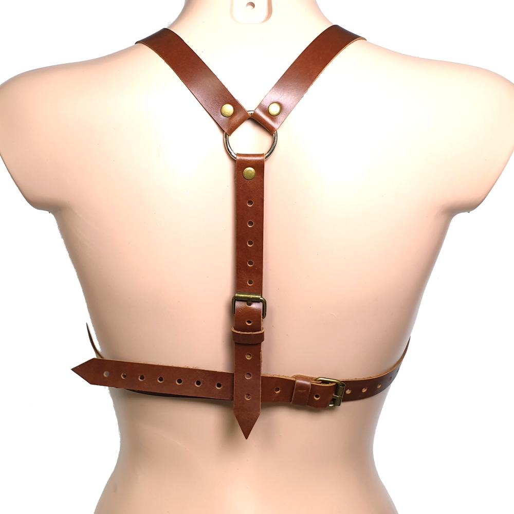 Сбруя-топ цвета антик - это элегантная и сексуальная одежда, расширяющаяся от груди до пояса. Она изготовлена из натуральной кожи и украшена металлическими элементами в виде круглых колец по бокам и спереди.