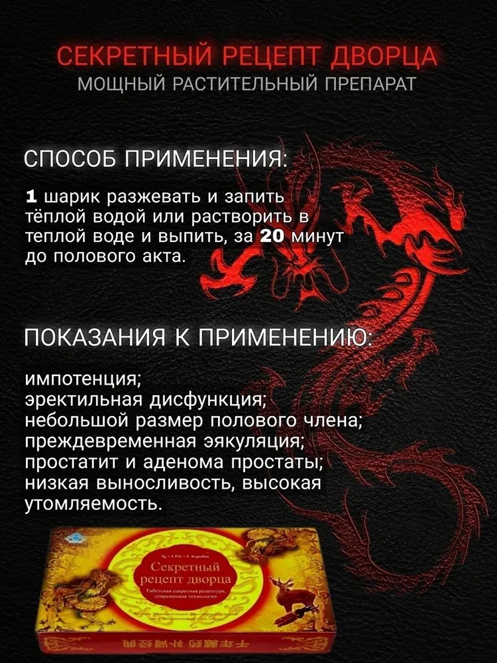 Секретный рецепт дворца -возбуждающее средство для мужчин желающих оставаться в расцвете сил на долгие годы. Возбудитель с быстром эффектом отлично решает проблемы с эрекцией, увеличивает продолжительность полового акта и даёт дополнительную выносливость. Препарат для потенции помогает быстро восстановиться после интима. Препарат можно принимать при гипертонии, сахарном диабете, можно сочетать с алкоголем.